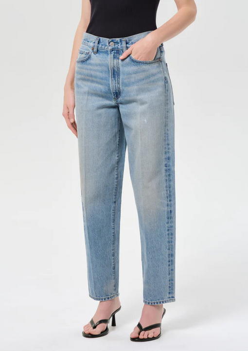 Looks Like: Medium vintage indigo denim pant with crease detail