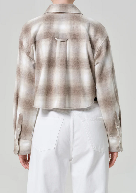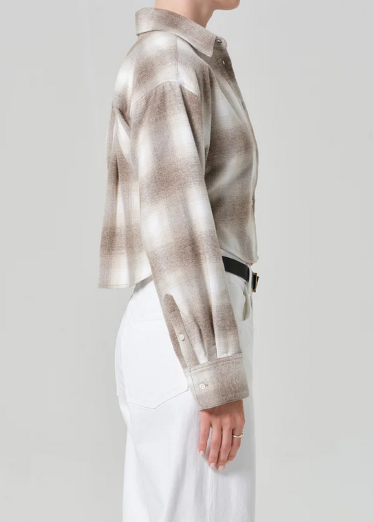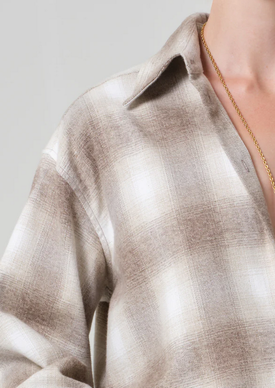 CloseA modern staple with a vintage nod, the Ana shirt is cut from ultra-lightweight Japanese flannel with an airy feel. The cropped silhouette and pointed collar lend sharp structure, while the blue micro plaid adds subtle depth.