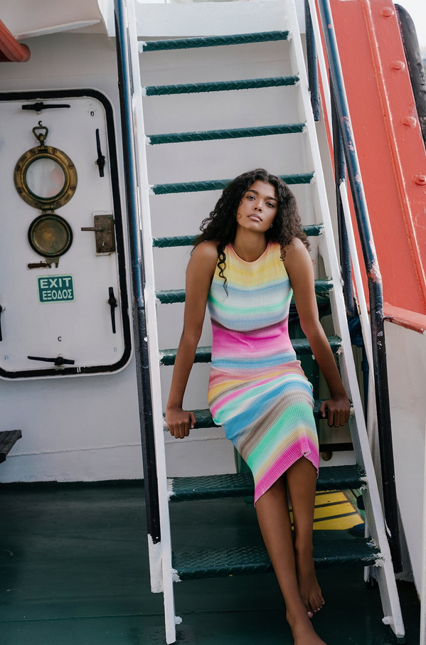 CloseHere comes our Rainbowlife Dress ~ the dress that feels like golden hour, spun into color. A soft, sleeveless knit with a clean silhouette and an easy midi length, she hugs just right and is made to turn everyday moments into something brighter.