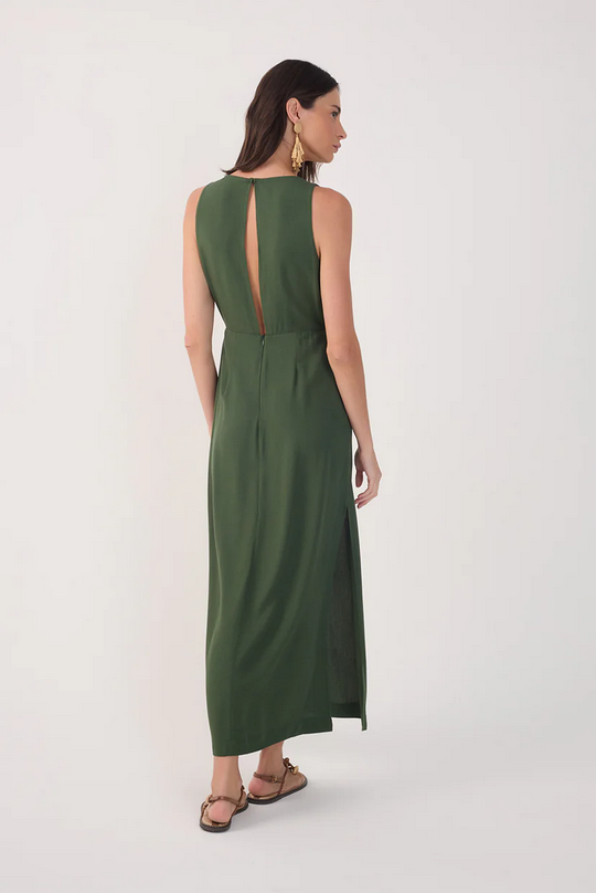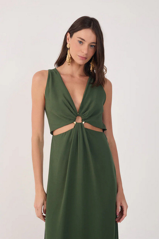 CloseThis Green Cut-Out Bodice Side Slits Maxi Dress has a midi length and side slits that bring movement and lightness to the look. The V-neckline with ring detail adds charm to the bust, while the cutout below enhances the silhouette with sophistication.