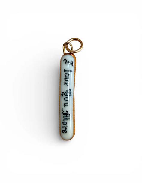 Think of it as a miniature treasure—best worn with care. Treat it like fine china: delicate, beautiful, and meant to be handled gently. While the porcelain and gold-filled components will not tarnish, the 22k gold luster is a delicate finish that can wear over time if exposed to rough handling, friction, or harsh chemicals.