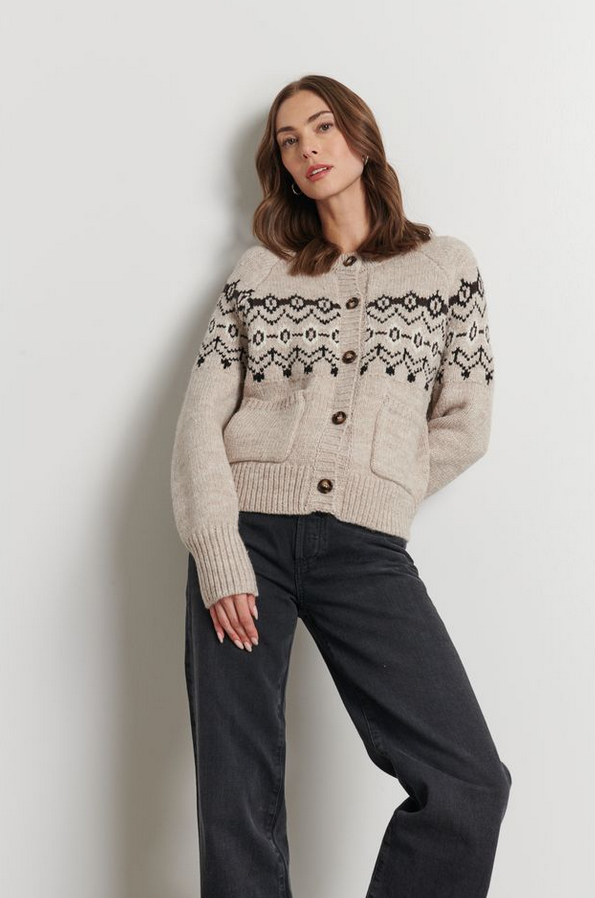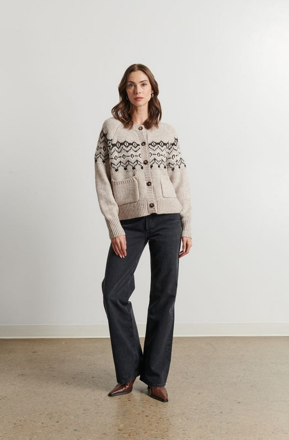 CloseThis cardigan is knit from a cozy wool blend in a neutral beige tone, accented with a black Fair Isle-inspired pattern across the yoke. It features a classic crew neckline, front button closure with tortoiseshell-style buttons.