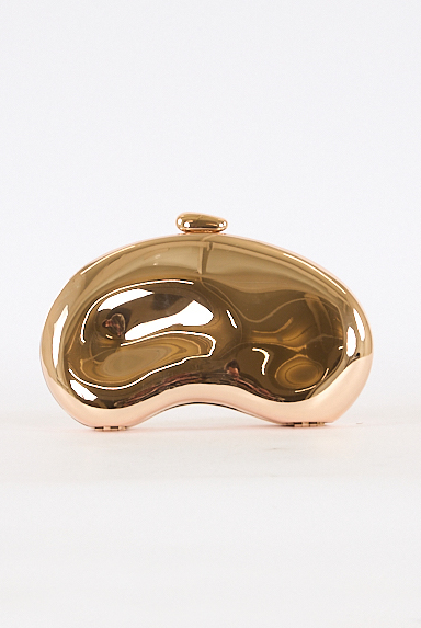 The Ramsey Handbag is a mirrored hard shell clutch with a removable gold chain strap.