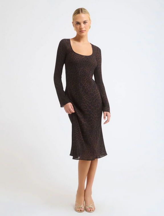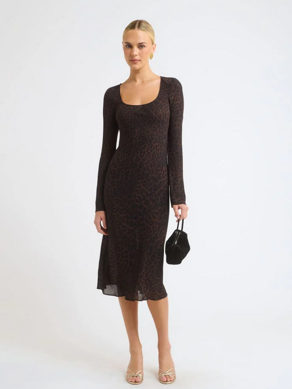CloseThe Roma Midi Dress is cut on the bias in a semi-sheer leopard georgette that drapes close without clinging. A scoop neckline, long sleeves, and adjustable back ties create subtle structure through the waist, while the fluid silhouette keeps things soft.